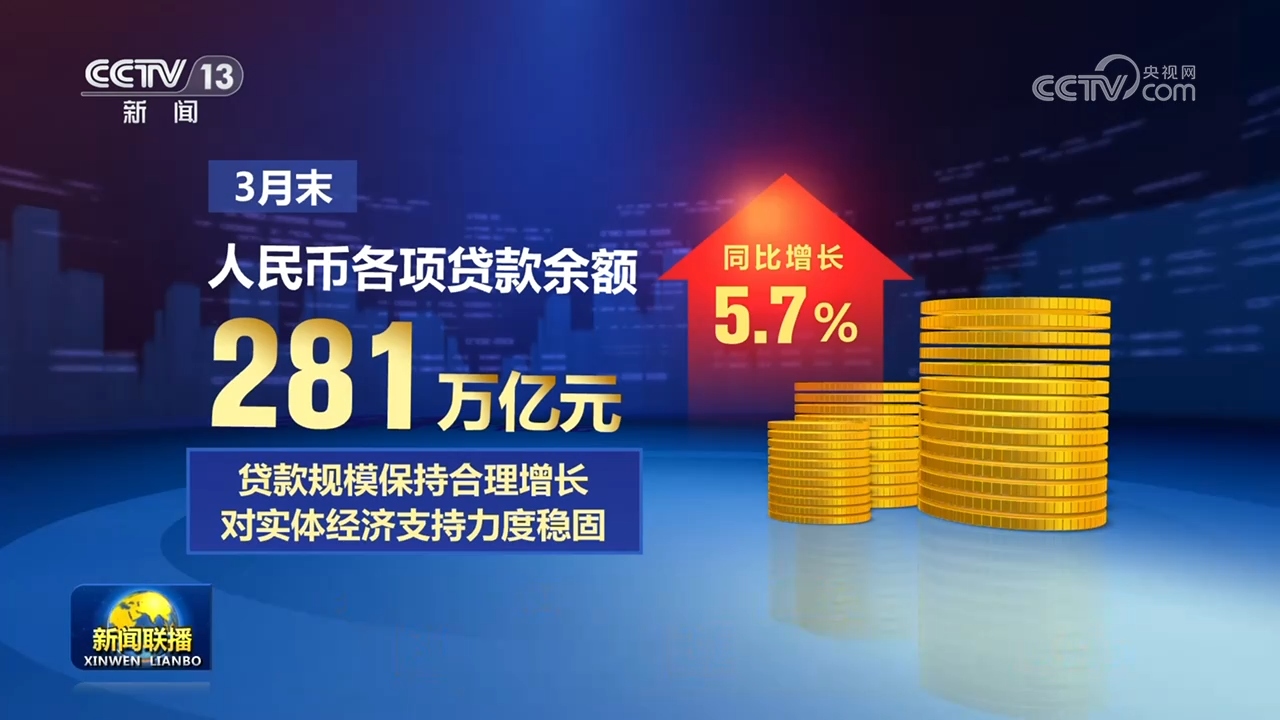 3月末,人民币各项贷款余额281万亿元,同比增长5.7%,贷款规模保持合理增长,对实体经济支持力度稳固。